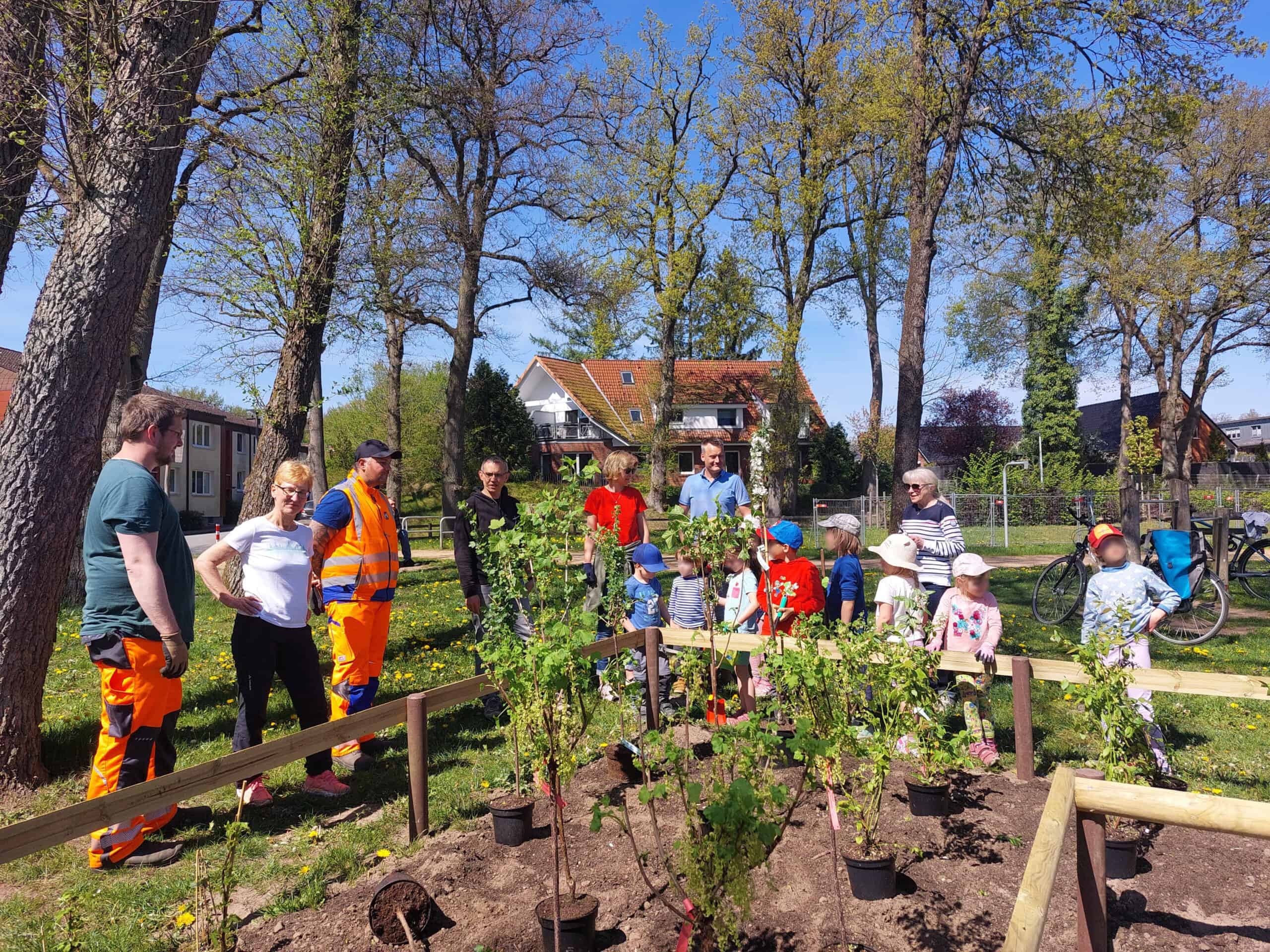 „Danach konnten wir Bauhofleiter Lars Schmidt und Frank Borgstedt vom Förderverein Jesteburger Spielplätze für das Projekt begeistern.“ Nach einigen Vorbesprechungen wurden am 28. April bei strahlendem Sonnenschein 34 Beerensträucher und drei Obstbäumchen gepflanzt.