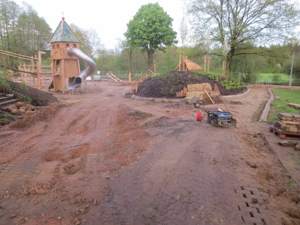 Förderverein: – viele Fundamentlöcher mit Schotter verfüllt, kleiner Verbindungsweg zwischen Treppe Seeveweg und Bikertreff ausgekoffert und geschottert, die Bodentrampoline-Löcher gefüllt, den angedeuteten Bachlauf gesäubert und mit Teichfolie vorbereitet, kleine Betonfundamente hergestellt, alle Wesersandstein-Sitzblöcke gereinigt, wieder einige Meter Kantsteine für die Wiederbelebung des Bestandsweges in Beton gesetzt und geschottert sowie beim Zugang Nachtigallenstieg die ersten Fahrradbügel gesetzt und die 2.Schicht Schotter verteilt … 🌞