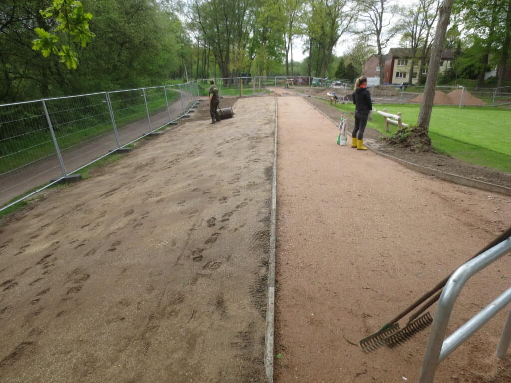 – und den Spielsand in die beiden Fallschutzflächen U3 Kleinkind und Ü3-Sandwelt verteilt, welche jetzt fertig gefüllt sind – wunderbar!!!