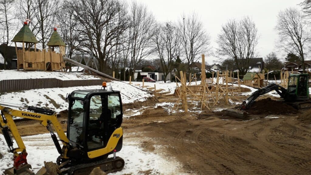– heute alle Robinienpalisaden-Köpfe geschliffen, die kleine Naturtreppe an der U3 Hangrutsche vorbereitet und wieder unzählige Mengen Beton verfüllt für Schilf-Stelzen-Parcour, Matsch-Anlage und U3 Hangrutsche