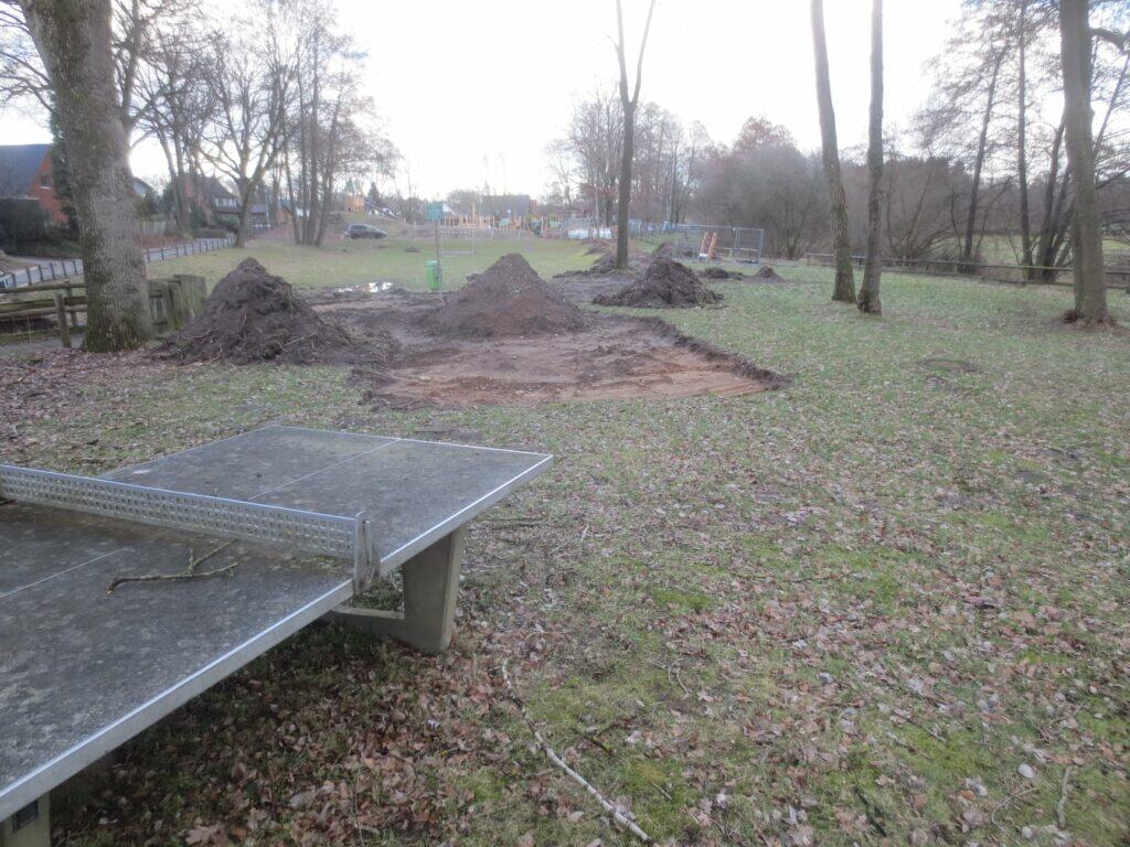 Danke an alle fleißigen Helfer 💪👷👷♂️ – heute weitere Robinienpalisaden-Köpfe geschliffen, an der U3 Hangrutsche die Robininentreppe fertig gestellt, Fallschutzflächen und Gelände von Bauresten gesäubert, Schilf-Stelzen-Parcour von seinen „Stützen“ befreit, Sitz-Natursteine bearbeitet, weiteren Fallschutzbereich für Sitz-Drehkarussell gebaggert…
